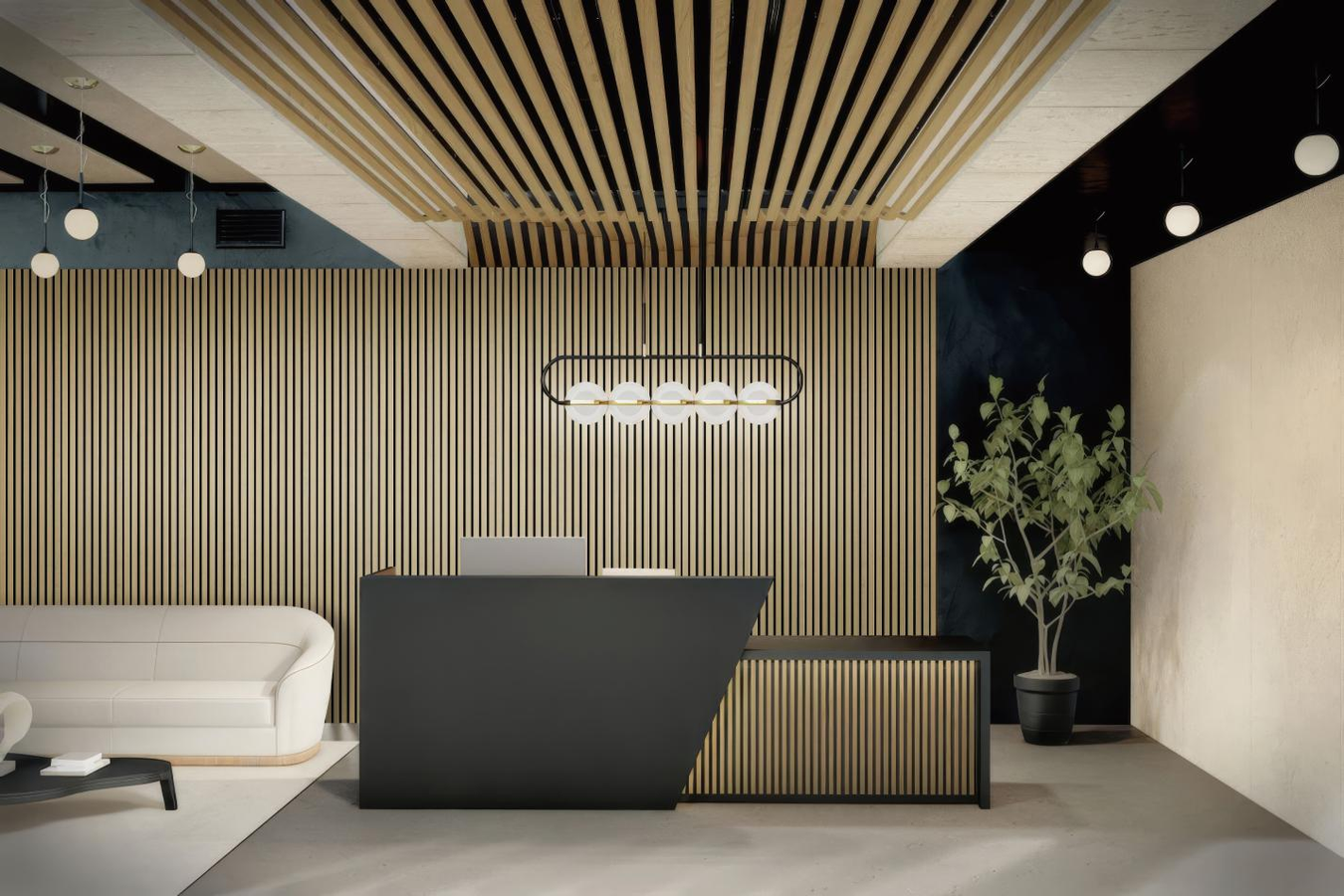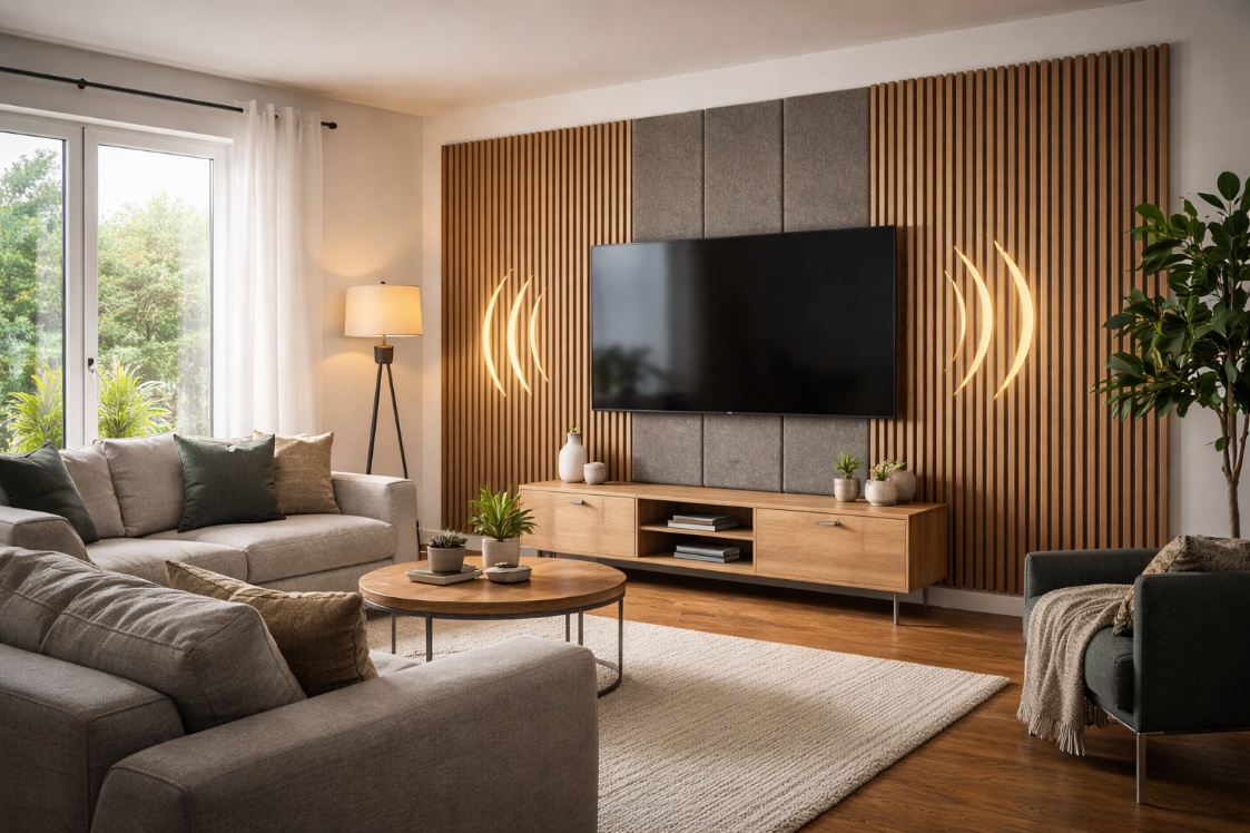 Wood-slat acoustic panels combine design impact with practical noise softening. No wet work. Minimal tools.