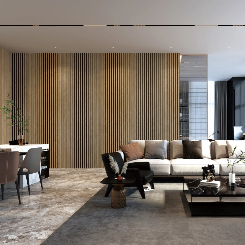 Unisoar acoustic slat wood panels combine refined oak aesthetics with proven sound absorption for living rooms, home cinemas, studios, and offices—reduce echo and improve speech clarity without sacrificing style.